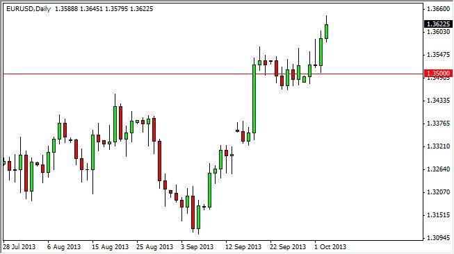 The EUR/USD pair rose during the session on Thursday, breaking above the 1.36 handle finally. Now that we are above there, looks like this market certainly is biased to the upside, and with the nonfarm payroll numbers coming out later today it's very likely we could get a large move. However, it's also possible that we get a bit of a shock, and that of course can put the markets into complete disarray.