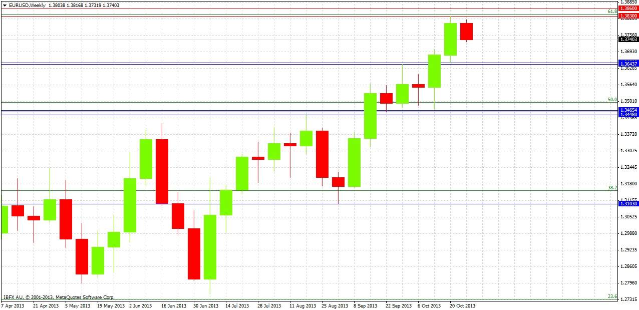 Last week was a solidly bullish candle. So far this week has been a bearish inside candle. The bullish momentum was not able to penetrate beyond 1.3830 – 1.3860 as these were weekly highs when price was last in this area, and there is confluence here with the 61.8% Fibonacci retracement of the 2011-2012 large, long-term down move. As expected, it will take some consolidation for this zone to be breached to the upside, if at all.