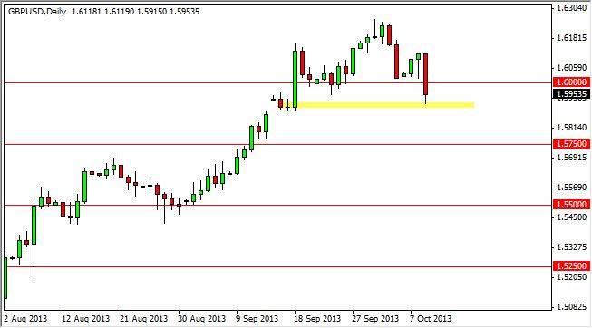 The GBP/USD pair fell hard during the session on Wednesday, breaking through the 1.60 level like it wasn't even there. I have to be honest, I didn't think this would happen quite this way, but it still shows signs of support right around the 1.5950 area, an area that had a gap from a couple of weeks ago. That being the case, it doesn't really surprise me that the market stopped or didn't bounced slightly. However, I do see the potential for further weakness based upon the length of the red candle, and therefore would not be surprised at all to see this market fall to the 1.5750 level, the neck supportive area that I see on the chart.