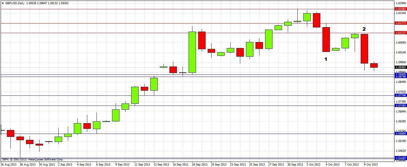 We can see there was a sharp move down at the end of last week (marked at 1), with a bearish reversal candle on Thursday followed by a strong down candle on Friday which closed hard on its low. Monday and Tuesday this week then produced two small pull-back candles that closed near their highs. Yesterday then produced a strong bearish reversal candle that closed in the lower quarter of its range (marked at 2).
