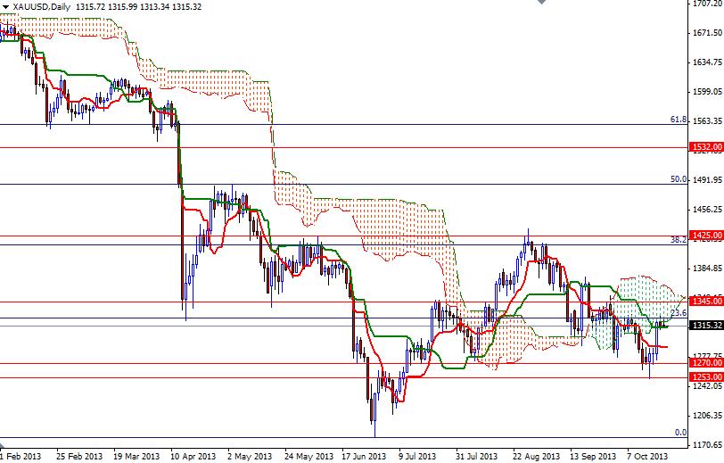 Gold prices (XAU/USD) settled slightly lower yesterday as the 1326 level, where the bottom of the Ichimoku clouds on the daily chart resides, continued to offer resistance. Today the markets will focus on the U.S. nonfarm payrolls report and unemployment rate. Data had been delayed due to the 16-day government shutdown.