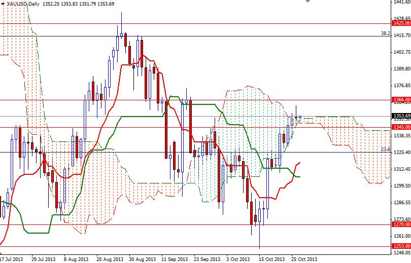 Gold prices (XAU/USD) settled slightly lower yesterday as investors took a cautious stance ahead of the U.S. Federal Reserve's monetary policy announcement. The XAU/USD pair traded as high as 1361.76 after a report released by the National Association of Realtors revealed that sales of previously owned homes decreased 5.6% in September. Separately, data released by the Fed showed that industrial production advanced 0.6%.