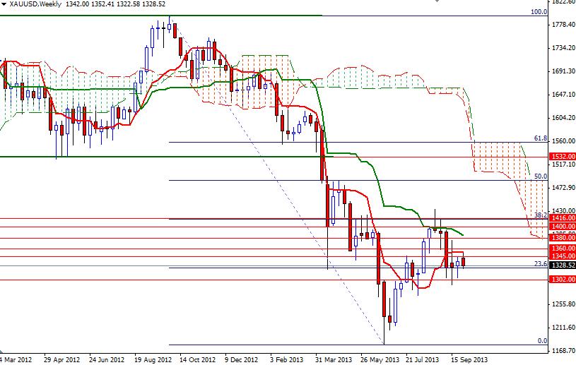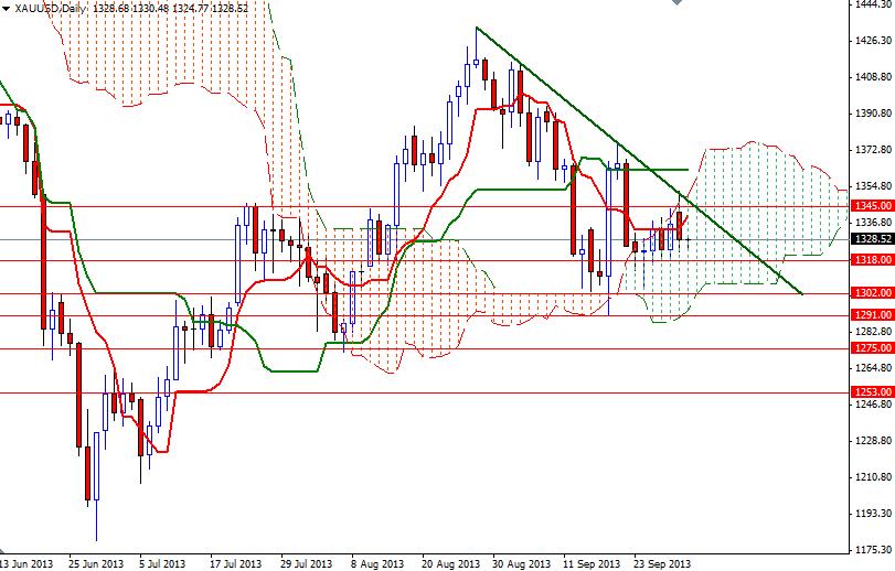 Although the XAU/USD pair started the week higher on signs that U.S. policymakers are struggling to avert a temporary government shutdown, the pair failed to break through the 1345 resistance and pulled back to the Fibonacci 23.6 level (based on the bearish run from 1795.75 to 1180.21). Despite a combination of gold supportive factors such as, political turmoil in Italy, Fed's willingness to maintain its massive stimulus, concerns over the U.S. government budget and the debt ceiling impasse, prices have been suffering due to weakening demand.