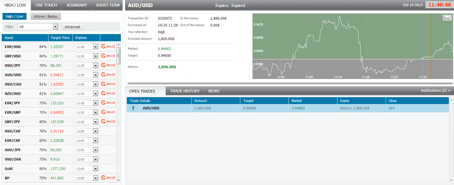 The market price for AUD/USD at the buying time (11:29) was 0.94650 for the expiration of 11:40. The Asset closed on 0.94662 and I made $1296.