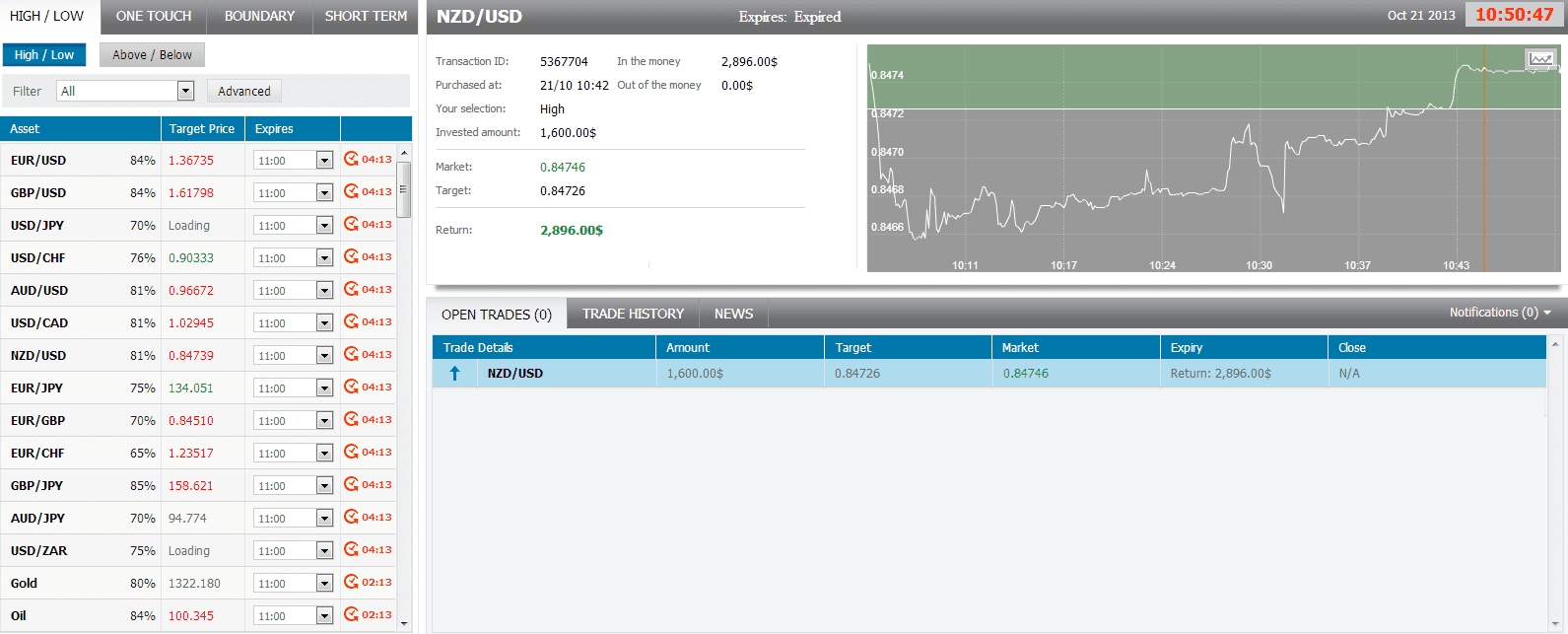 The target price for NZD/USD at the buying time (10:42) was 0.84726 for the expiration of 10:50. The Asset closed on 0.84746 and I made $1296.