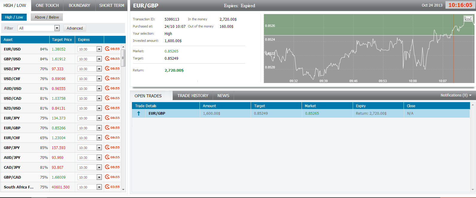 I logged in the OptionFair™ binary options trading platform and I traded $1600 on the "High" instrument. This kind of option has a return of 85% if the option will close above the target price, which means that if the signal is correct I could get a return of $1360 on my investment.