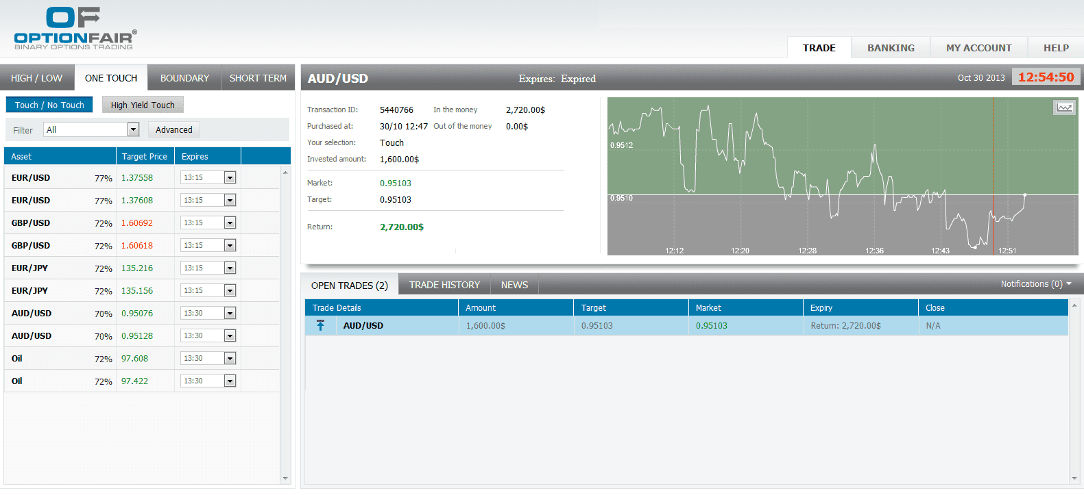 The market price for the AUD/USD at the buying time (12:47) was 0.95083 and the target price was 0.95103 for the expiration of 13:00. The Asset touched my target price at 12:53 and I made $1120.