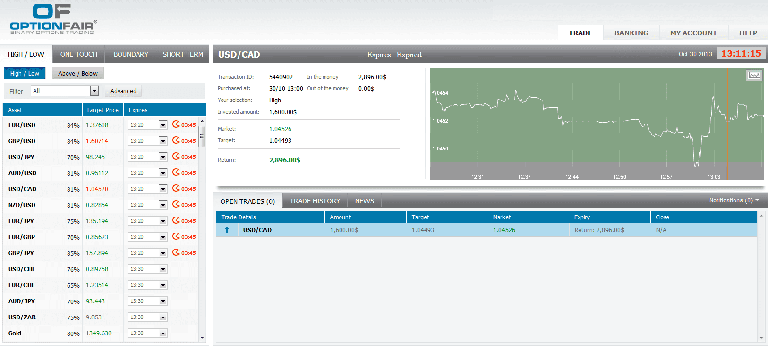 The target price for USD/CAD at the buying time (13:00) was 1.04493 for the expiration of 13:15. The Asset closed on 1.04526 and I made $1296.