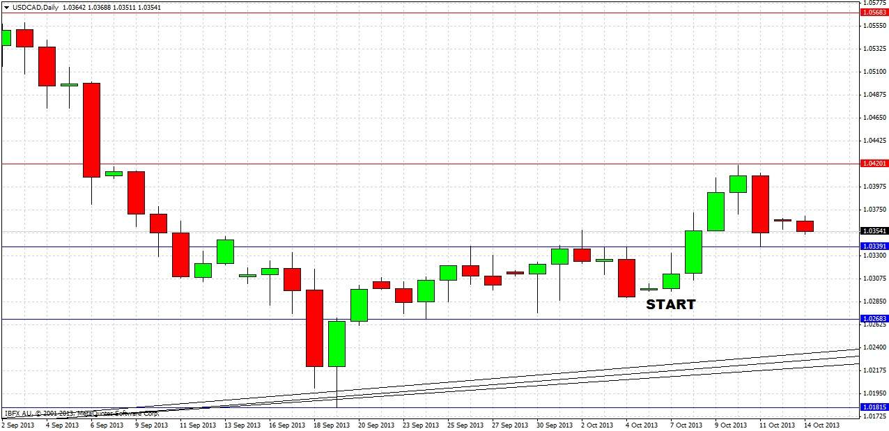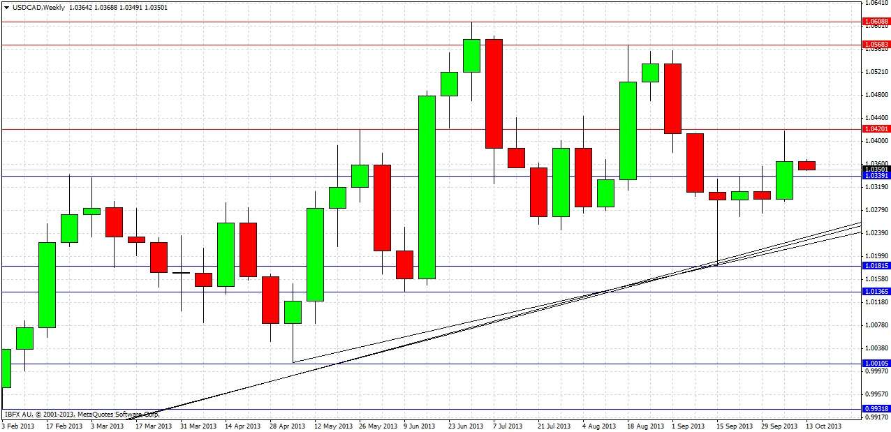 The long-term upwards trend is still entirely intact. Last week was a bullish reversal candle, but it only closed about halfway up its range, so it is not a very reliable bullish sign. This chart does not tell us much else, except that last week’s high at 1.0418 might prove to be fairly strong resistance at it coincides with the overlap zone between the two large consecutive bearish weeks in August.