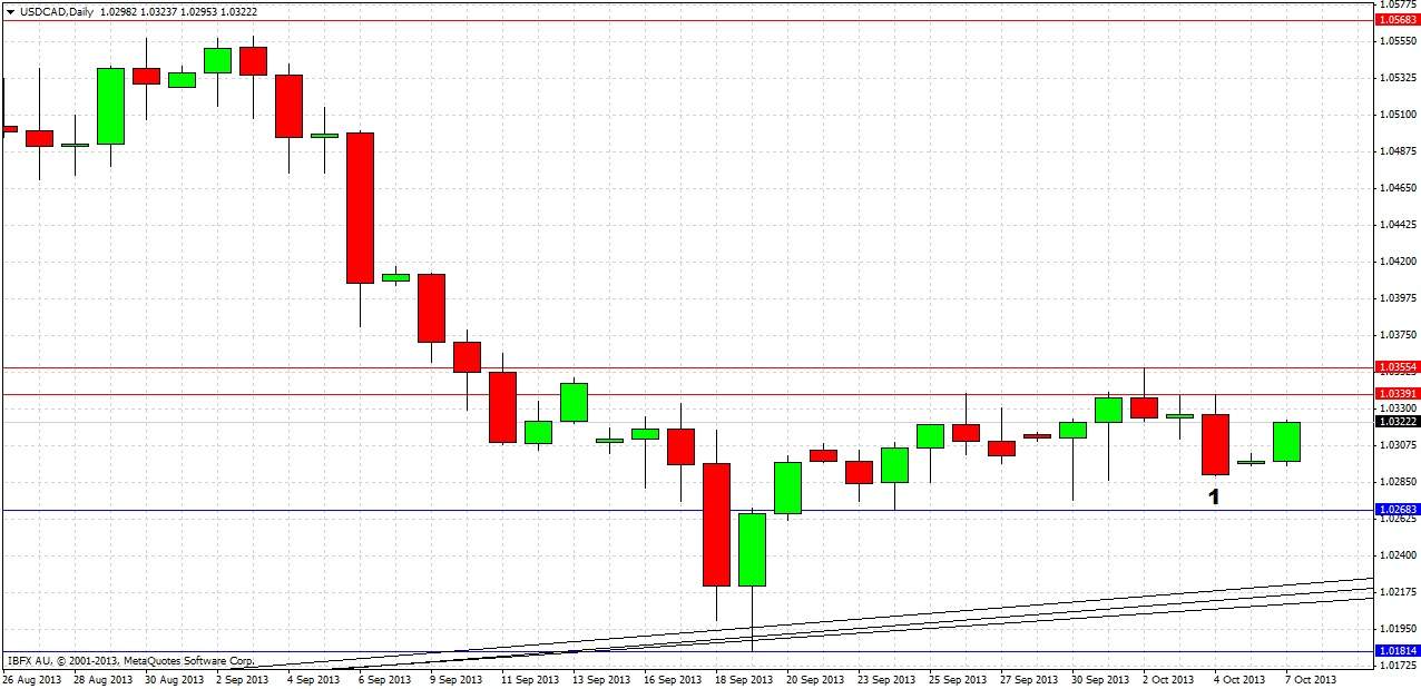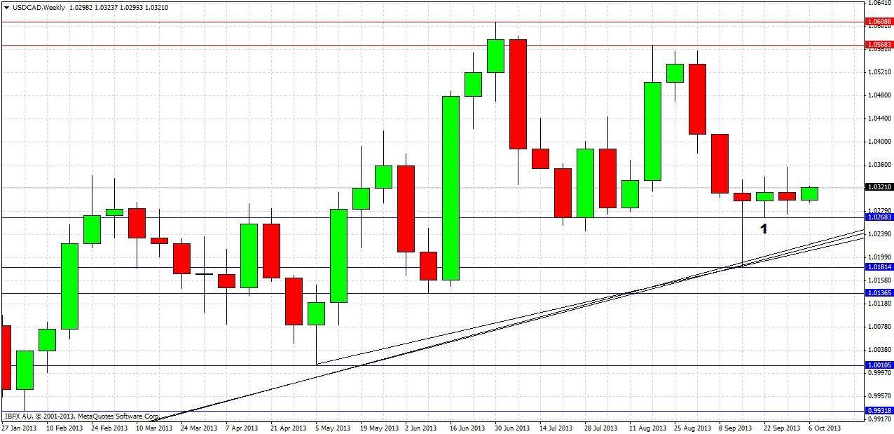 The action has been very quiet over the previous two weeks. Since the pin bar off the bullish trend lines, we had a very tiny bullish reversal candle (marked at 1), then a near doji candle last week. Note that the low of the bullish reversal candle at 1.0268 has held, so it is quite likely to act as support given the general bullish trend.