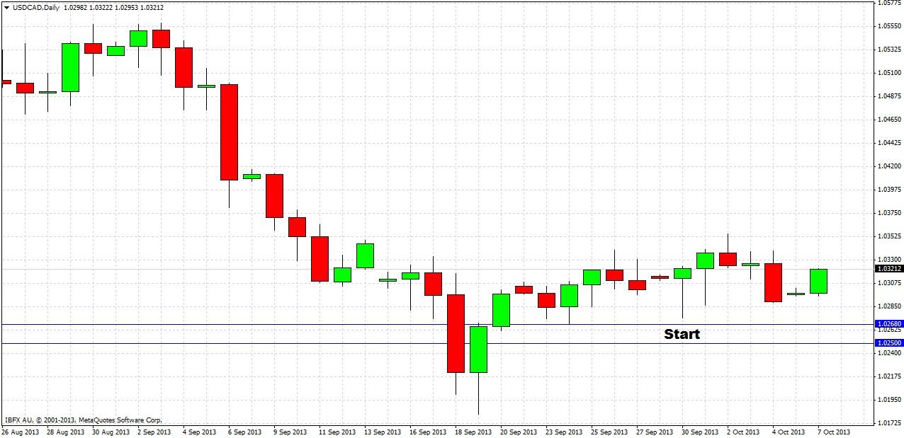 We can see that short-term resistance was established by both last week’s high at 1.0355, and the high of Friday’s bearish reversal candle (marked at 1) at 1.0339. Support is at 1.0268.