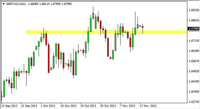 The GBP/CAD pair initially fell during the session on Monday, but as you can see bounced enough to form a nice looking hammer. It appears that the 0.68 level is trying offer some type of support, and as you can see, it has been resistance in the past point all the way back to 1 October. With that being the case, it makes sense that we would have buyers in this vicinity, but one thing that concerns me a bit is the fact that the markets have struggle to go higher over the last several sessions. With that being the case, we have to pay attention to both the British pound and the Canadian dollar against the US dollar, as it shows relative strength between the two currencies.