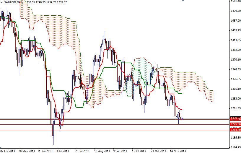 The XAU/USD pair closed yesterday's session lower than opening after the latest reports released from the Unite States provided further evidence that the world's biggest economy is on the right track. According to the report released by the Labor Department, the number of first-time applicants for jobless benefits dropped by 10000 to 316000. The Chicago purchasing managers’ index came out stronger than expected with a print of 63.0 and the University of Michigan reported that its consumer sentiment index climbed to 75.1 from 73.2 a month earlier. The bulls continue to suffer as a direct result of a strengthening American dollar but still trying to hold prices above the 1237 level. With the Thanksgiving holiday, it is very likely that today's trading activity will be light and this could keep the market quite flat in the end.