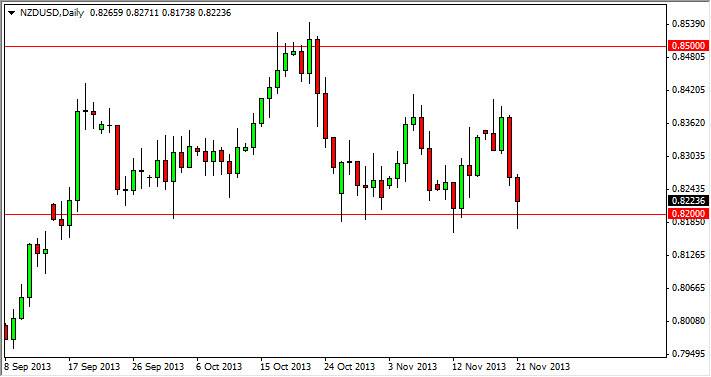 The NZD/USD pair fell during the session on Thursday, but as you can see found enough support just around the 0.82 handle in order to bounce and form a hammer like candle. As a reasonably looking supportive candle and as a result I think that this market will continue to consolidate between the 0.82 level, and the 0.84 level. That simply is a return to the "status quo”, if we do get a bounce from here, and quite frankly, I believe that the risk in going long at this point time is worth it.