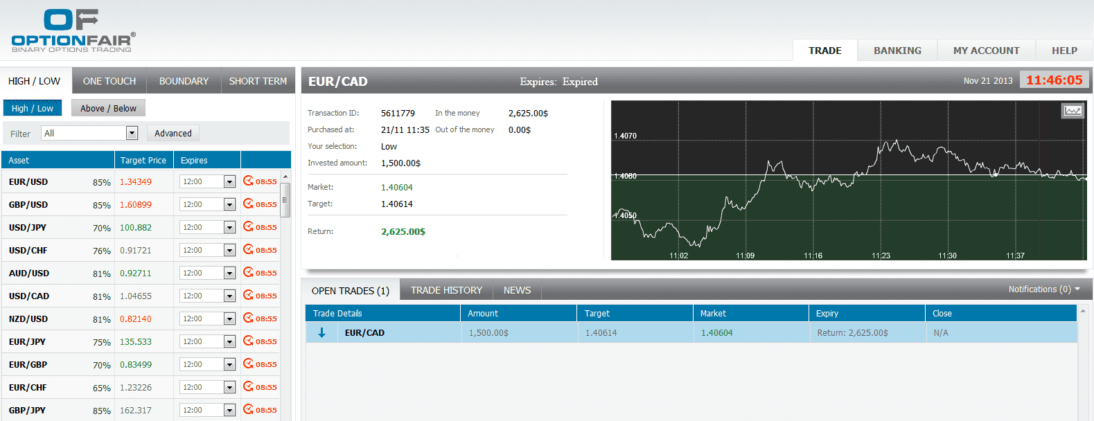 I logged in the OptionFair™ binary options trading platform and I traded $1500 on the "Low" instrument. This kind of option has a return of 75% if the option closes below the target price, which means that if the signal is correct I could get a return of $1125 on my investment.