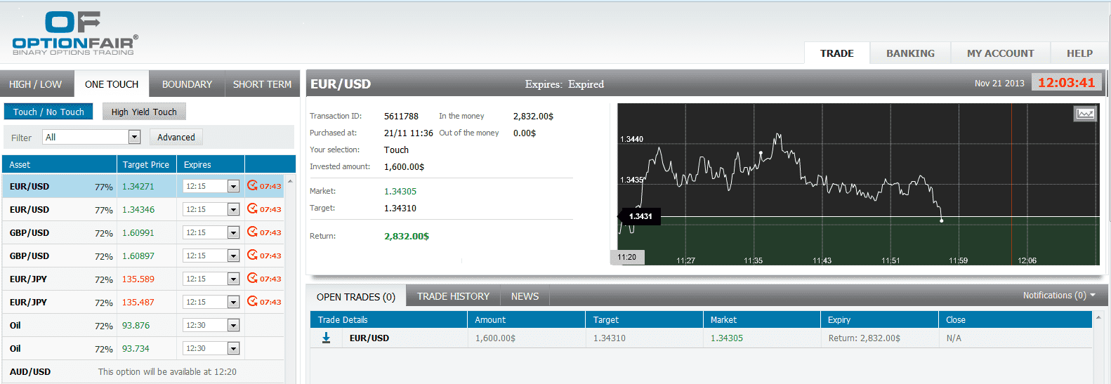 With OptionFair™ binary options trading platform, I traded $1600 on the “Touch Down” instrument. This kind of option has a return of 77% if the option touches the strike price prior to expiry, which means that if the signal is correct, I could get a return of $1232 on my investment.