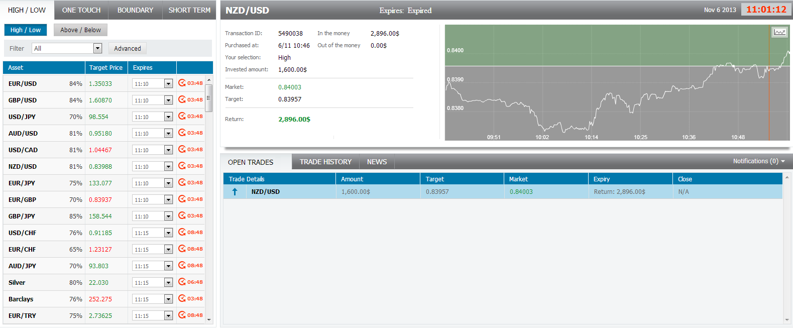 The target price for NZD/USD at the buying time (10:46) was 0.83957 for the expiration of 11:00. The Asset closed on 0.84003 and I made $1296.