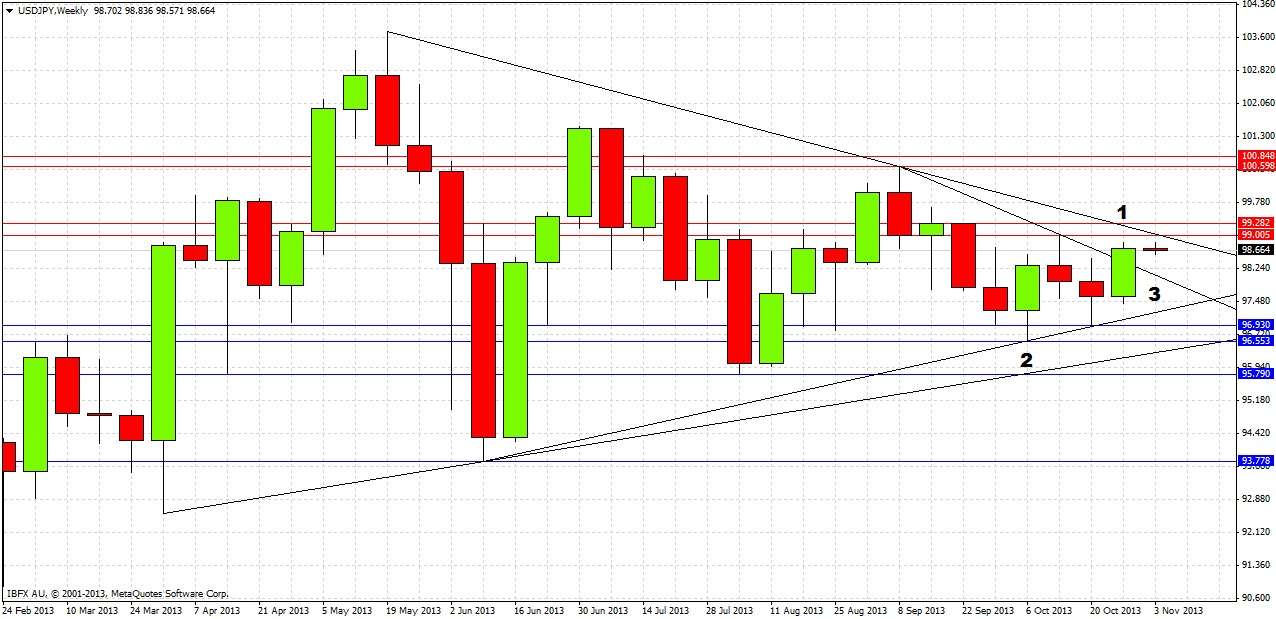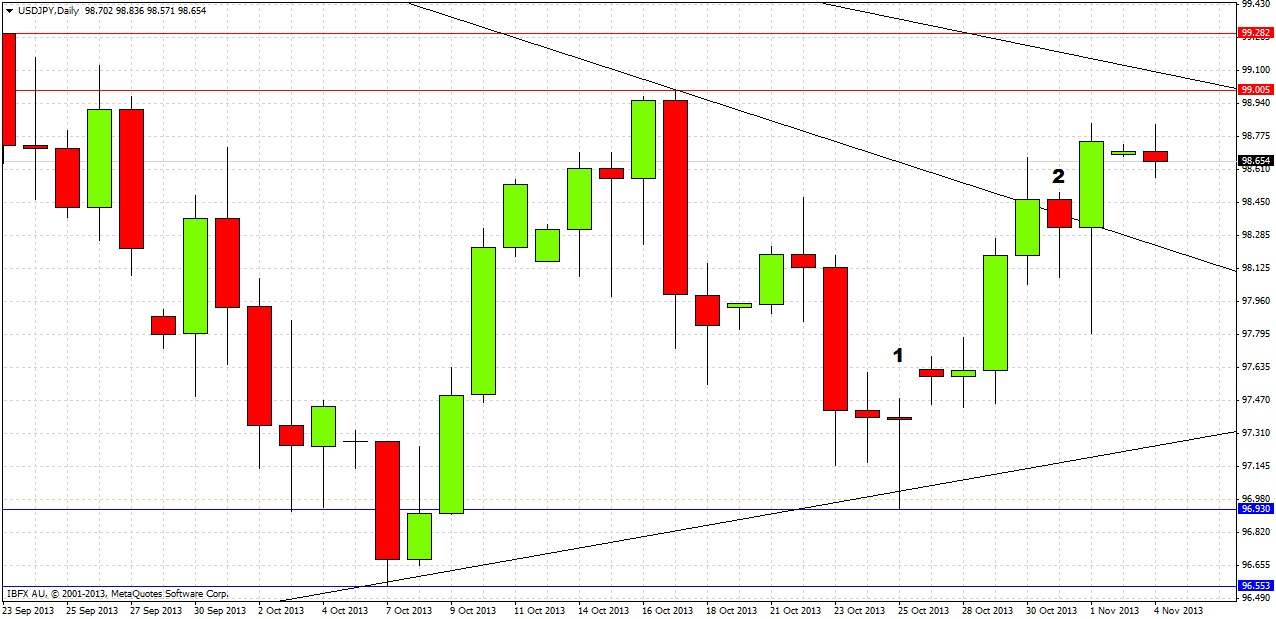 A few bullish signs are also showing here. As we identified last week, the previous Thursday and Friday were very significant, producing an inside candle followed immediately by a pin candle marked at (1) off the more reliable, long-term lower triangle trend line. This was the start of the bullish move. After a couple of good up days, we see the price falter at the inner higher triangular trend line with the inside candle marked at (2), before breaking up and producing a very bullish outside bullish reversal candle the next day, making a weekly high just below the 99.00 level. Although we have good bullish momentum and things look pretty bullish on all time frames generally, we have to be cautious as to the uptrend’s further progress, because we are now close to the strong resistance zone from 99.00 to 99.28, confluent with the higher upper triangle trend line.