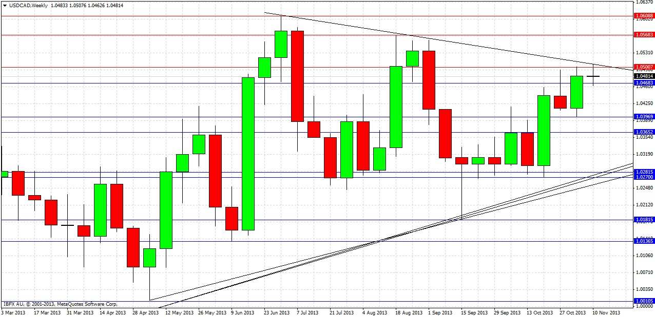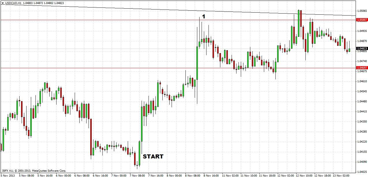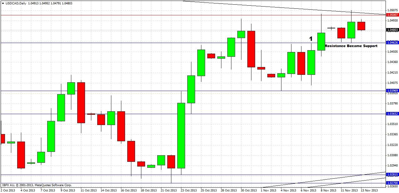 5. If the price makes a sustained break and closes above 1.0500 and the upper triangle trend line, this would be a very bullish sign, and the price should then move towards 1.0565. A good place to go long would be on a pull back to the 1.0500 level after the breakout, or the broken bearish trend line.