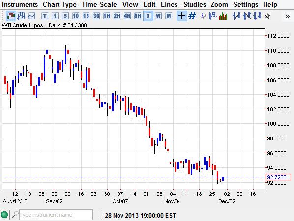 The nonfarm payroll numbers come out this Friday, and they will have a drastic effect on this market. Strong nonfarm payroll numbers out of the United States will suggest that the Federal Reserve can taper quicker than anticipated, and that should drive the value the US dollar higher. If we have that happen, the value of oil should drop. However, there does come a point in time where the effect of a stronger US economy actually drives up the price of oil, but my feeling is that the initial reaction will be a run to the US dollar, and out of commodities in general.