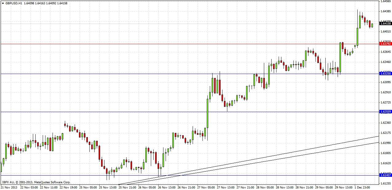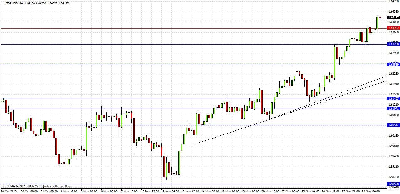 The pair has been in a strong uptrend since early November, dramatically breaking through the key 1.6250 resistance level last week, and making a new 2 year high last Friday, as shown in the 4 hour chart below, marked with key S/R levels and a bullish trend line.