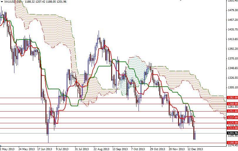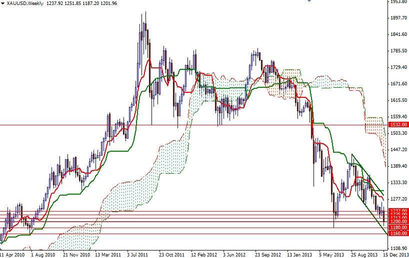 Gold finished down on the week as the news of less quantitative easing by the Fed was enough for the bears to overtake the bulls. The XAU/USD pair traded as low as 1187.20 but managed to close just above the 1200 after investors decided to take some of profit off the table on a possible double bottom formation. The primary driver of gold prices last week was the Fed's policy decision to throttle down from its ultra-accommodative monetary policy stance. I think also the perception that the stock market rally will continue through the first quarter of 2014 dulled the shiny metal's attractiveness. Because of that I will also keep an eye on the major stock markets as well as the USD/JPY pair. If stocks extend their gains, there will be even less reason for investors to buy gold.