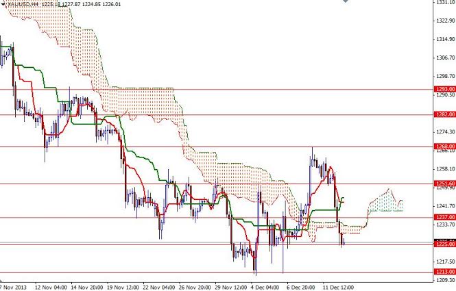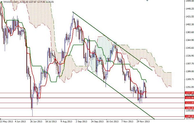 Currently the XAU/USD pair is hovering just above the 1225 support level. However, prices are below the Ichimoku cloud on the 4-hour time frame and we have a bearish Tenkan-sen (nine-period moving average, red line) - Kijun-sen (twenty six-day moving average, green line) cross. Short term technical outlook indicates that selling could continue to the next support area between 1213 and 1200, if the 1225 level fails to hold the market.