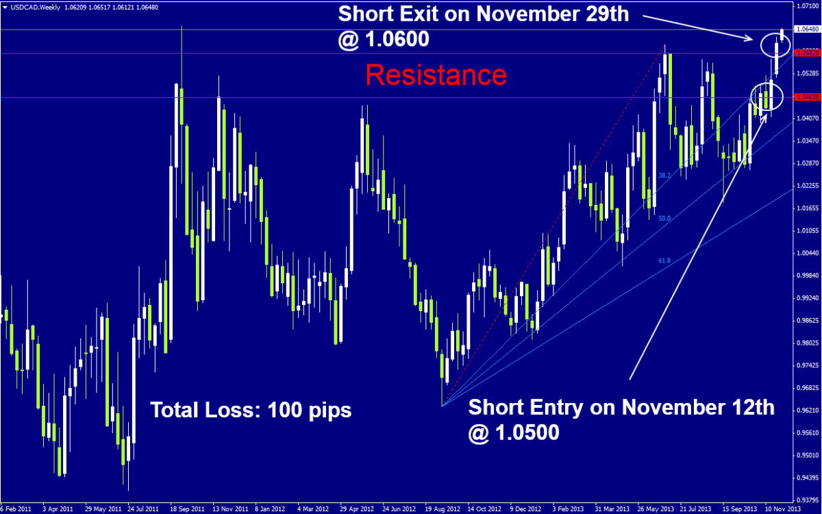 USDCAD Short Signal from November 12th was closed for a loss of 100 pips as the stop loss order was triggered at 1.0600.