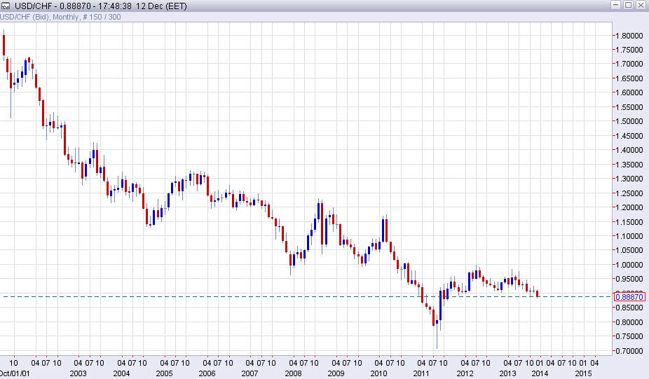 The USD/CHF pair has been drifting sideways for the entirety of 2013. In fact, it did it in 2012 as well. This is why I have done very little analysis involving the Swissy this past year, and predicting the move in 2014 is certainly going to be a challenge of sorts. However, you have to keep in mind that this pair will move counter to the EUR/USD pair, and that market can sometimes help a bit with the analysis of this one.