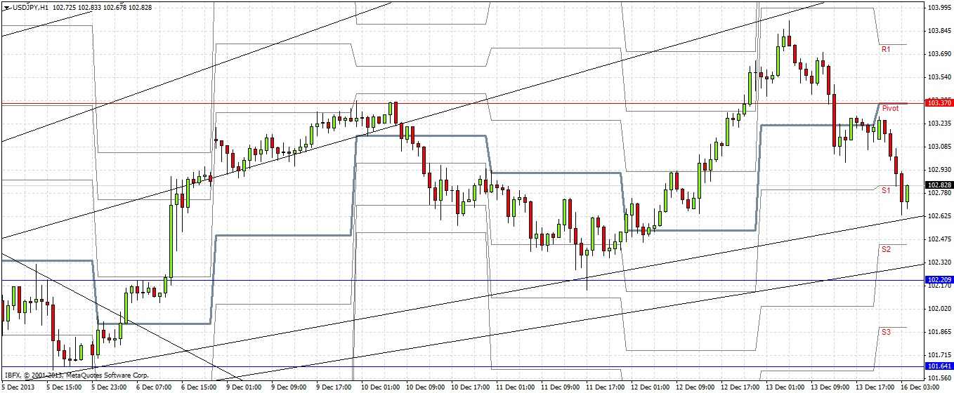 As the channel has held, I am more comfortable looking for longs. This is not provided as a signal but be aware that the level of 103.37 is confluent with both of the previous tops in the double top and today's daily pivot point, it also acted as minor support late last week. This may be a natural barrier and the beginning of a strong fresh fall in price.