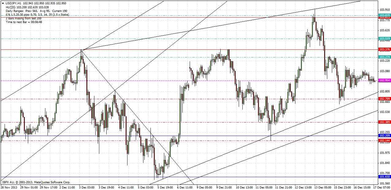 Nevertheless the resistance levels above do not look very firm to me so I am not looking at any possible short trades yet. However, do be aware that the level of 103.37 is confluent with both of the previous tops in the double top and today's daily pivot point; it also acted as minor support late last week. This may be a natural barrier and the beginning of a strong fresh fall in price.
