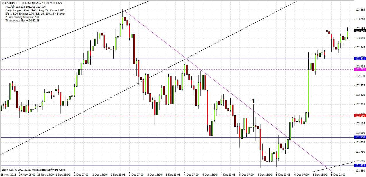 Enter long at the next bar break of an hourly pin, strong engulfing or outside bar rejecting and closing above both the support level of 102.82 and the GMT daily pivot point at 102.70. If both of these points are not touched and rejected by the same hourly bar, or if an hourly bar closes below one of these levels, the trade is immediately invalidated and should not be taken.