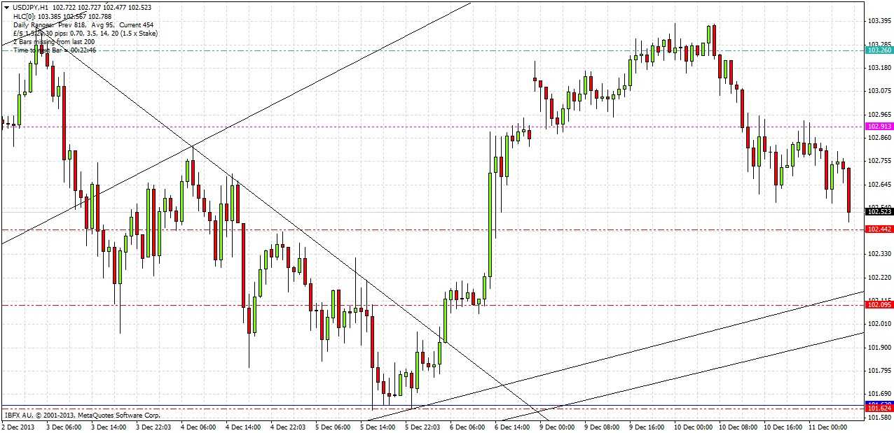 Enter long at the next bar break of an hourly pin or strong outside bar rejecting and closing above the support level of 101.65. If this level is not touched and rejected by the same hourly bar, or if an hourly bar closes more than a few pips below this level, the trade is immediately invalidated and should not be taken.