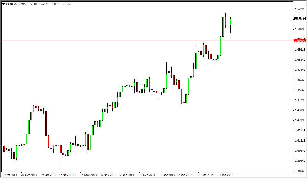 Even if we were to fall from here, my suspicion is that the 1.50 level will offer enough support to keep it as simple consolidation, or perhaps a rest in an otherwise very bullish market. That’s something that the market be from time to time, and as strong as the uptrend is been that would exactly be a huge surprise. The Euro is still strong overall, and because of that I believe that this pair should go higher overall anyway. On top of that, the Canadian dollar has been absolutely pummeled as well, so this pair is being pushed higher from at least two different directions. I believe buying dips will be the way to go going forward, and that the 1.55 level will be targeted eventually.
