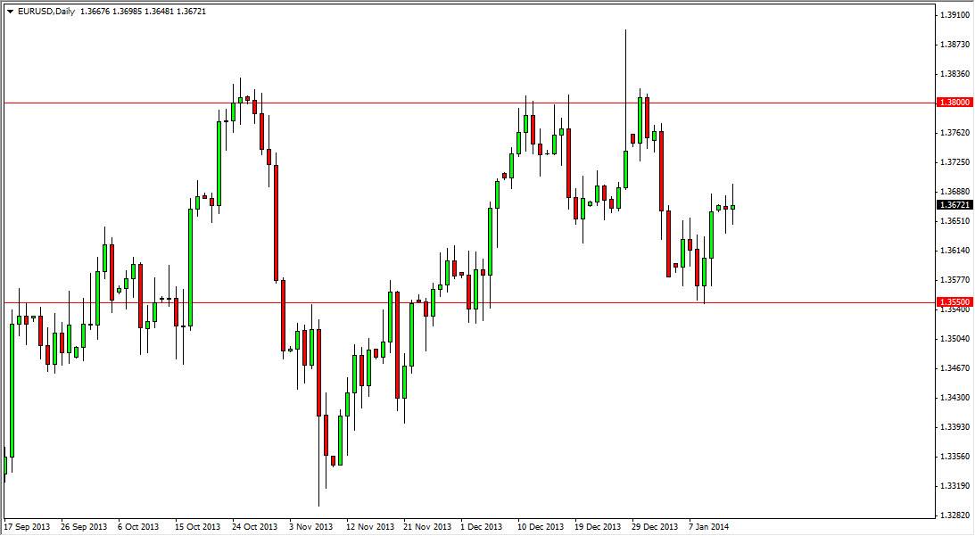 The EUR USD pair went back and forth on Tuesday, essentially tracing the range from the Monday candle. The Monday candle was a hammer though, and as a result it looks like the market is ready to find buyers in the general vicinity of the 1.3650 level, which could send it higher. That being the case, I feel that this market will more than likely continue to go higher, but also recognize that there is quite a bit of noise between here and the 1.38 handle, which I believe is the target of the market.