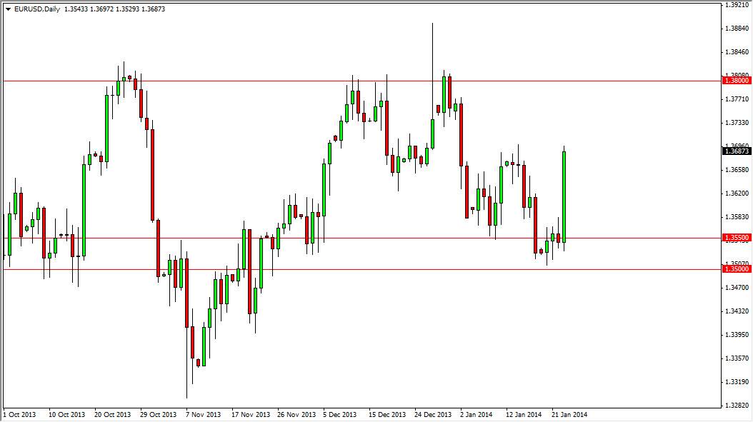 The EUR/USD pair had an absolutely phenomenal day during the session on Thursday, using the 1.3550 level as a launching pad. This area was the top of a larger support area, and therefore it’s not surprising to see this market bounce. However, I had mentioned that the 1.37 level would be resistive. To be honest, I’m quite surprised that this market made the move in just 24 hours! With that, it appears that the Euro is going to continue to strengthen for the time being.