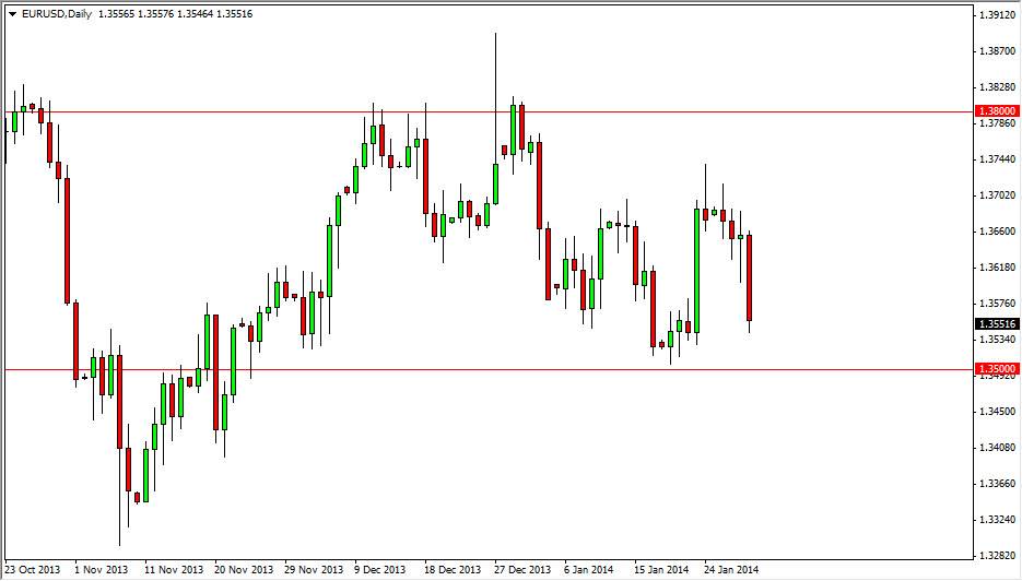 The EUR/USD pair fell rather hard during the session on Thursday, testing the 1.3550 level. This is the beginning of significant support down to the 1.35 handle as far as I can tell, and as a result I would expect to see some type of supportive action in this general vicinity as I do not think that this pair is ready to break out of the consolidation range that we’ve seen for some time. However, I’m not willing to put any money at risk until I see that supportive candle, and as a result I’m essentially on the sidelines for the session.