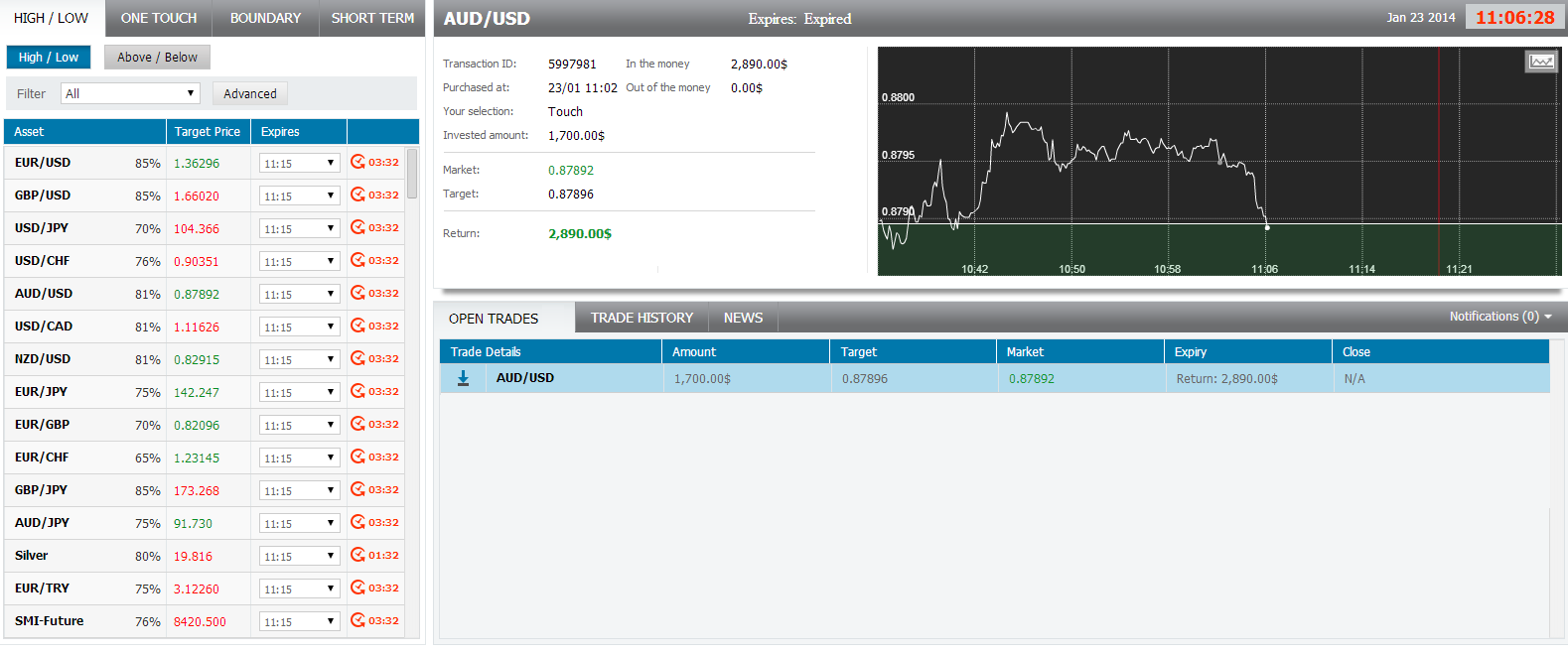 With OptionFair™ binary options trading platform, I traded $1700 on the “Touch Down” instrument. This kind of option has a return of 70% if the option touches the strike price prior to expiry, which means that if the signal is correct, I could get a return of $1190 on my investment.