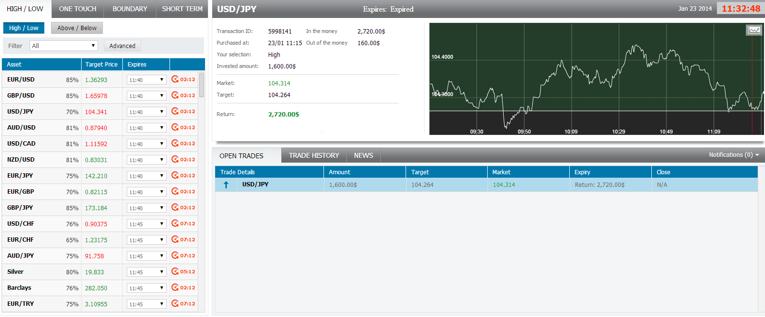 I logged in the OptionFair™ binary options trading platform and I traded $1600 on the "High" instrument. This kind of option has a return of 70% if the option will close above the target price, which means that if the signal is correct I could get a return of $1120 on my investment.