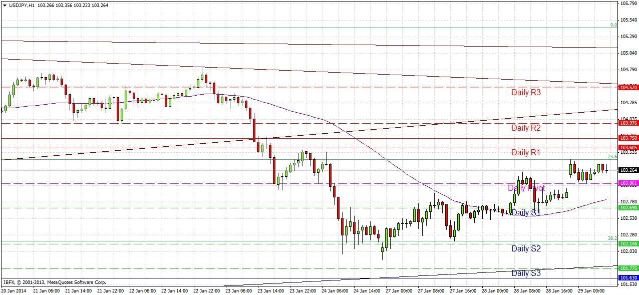 Enter short if a pin or engulfing bar is formed on the hourly chart when the price first reaches 103.75, on the break of the bar by 1 pip on the next bar. If a bar closes above 103.75, the trade is invalidated.