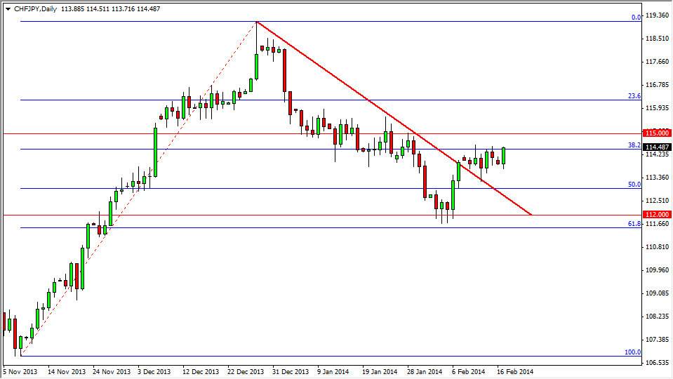 I see the 115 level as being very important in this market. Whether or not you choose to trade this pair is a completely different question, but if we get above the 115 level in this market, and especially the 116 level, I believe that the Japanese yen will get absolutely pummeled against most other currencies. You can use this pair as an indicator, and never actually trade it, but find quite a bit use for it. The spread is normally pretty decent, depending on the broker. For myself, I normally see about a 4 PIP spread, and that were me is very reasonable. Granted, the daily range tends to be rather slam, but it is a decent trade to hang onto for longer-term positions.