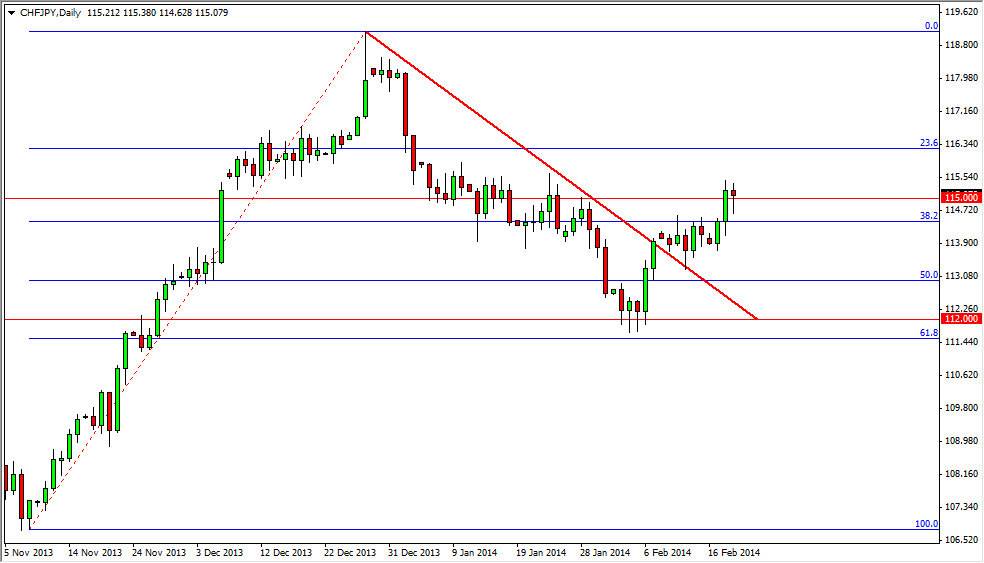 The CHF/JPY pair fell during the majority of the session on Wednesday, but bounced enough to form a hammer as the 115 level continues to offer a reactionary level to the market. The pair has found this area to be interesting over and over, and as a result I am not surprised to see the buyers step into the market in order to sell the Yen. The Yen is certainly on the back foot at the moment, and because of this I feel that even the lowly Swiss franc should continue to work its way higher against the Yen. The Bank of Japan continues to want a weaker yen, and as a result, I believe they will continue to work against the currency. The pair is the ultimate expression on where money is flowing as far as safety is concerned. The Swiss franc is also a safety currency as is the Yen, but it is obvious that more money is flowing to Switzerland than Japan. And that is the essence of what we are trying to figure out when we trade Forex.
