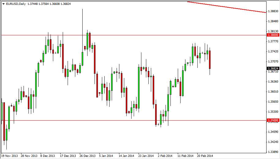 The EUR USD pair fell during the session on Wednesday, and even managed to close below the 1.37 handle. However, it wasn’t necessarily a convincing move and it’s easy to tell that there is quite a bit of support below this area anyway. Because of this, I’m not overly impressed with this move, and believe that the market will continue to grind back and forth as traders try to figure out what to do. Personally, I believe that this market is essentially stuck between the 1.35 level and 1.38 level, and probably will remain so for the foreseeable future.