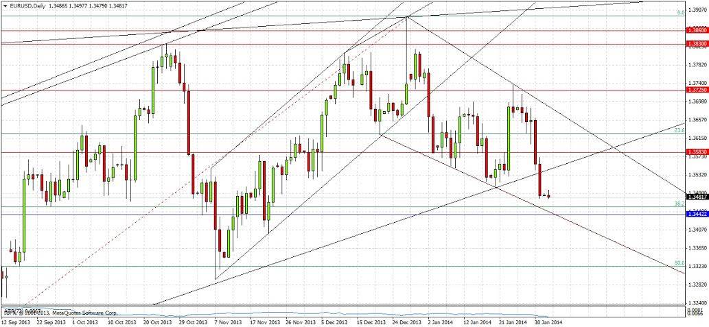 Last Friday we finally broke through the remaining bullish trend line and the previous support level of 1.3583. We are now firmly established within a bearish channel and as such it would seem that there is going to be more short than long potential. However this pair likes to pull back, so it is usually possible to play it both ways. There is a level of potential support at 1.3442 which right now is confluent with the lower trend line of the bearish channel: