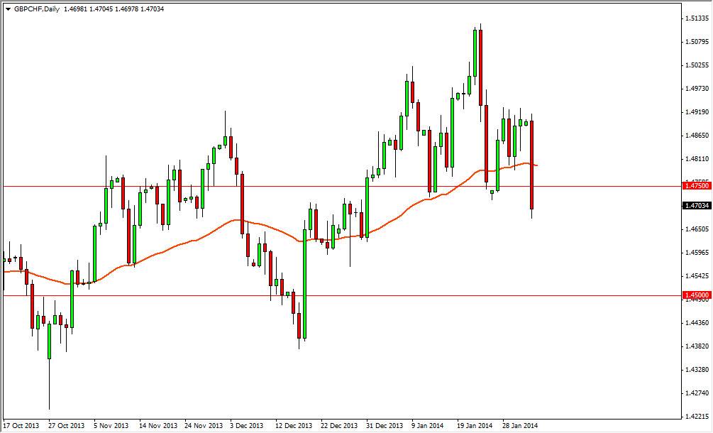 The GBP/CHF pair fell hard during the session on Monday, slicing through the 50 day moving average yet again. However, with more significant is that we for all the way down to the 1.47 level. That in my opinion is getting close to the bottom of the 1.4750 supportive “zone”, and as a result it will be very interested to see how this pair behaves of the next couple of sessions. Remember, this pair tends to act along with risk appetite in general, and as a result I will be watching stock markets around the world for clues as to where that is going.