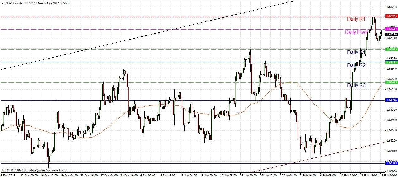 The end of last week saw the pair make a dramatic parabolic high. The resistance level of 1.6620 did hold very briefly before the price broke upwards very strongly, therefore I see this level as likely support. I had also expected the key psychological level of 1.6750 to provide some resistance but the price just blew right through this level. Due to the extreme strength of the GBP, I am not looking for any short trades. The nearest strong support will probably be at 1.6620, which is almost exactly confluent with today’s GMT S2 daily pivot point, and 20 pips above a round number, so there is some confluence there.