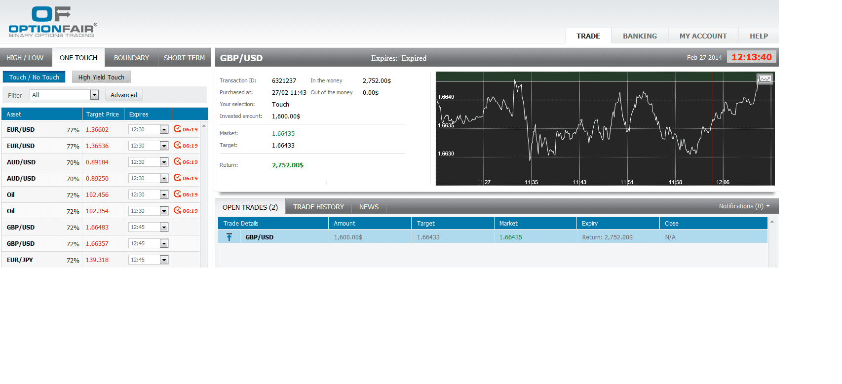 With OptionFair™ binary options trading platform, I traded $1600 on the “Touch” instrument. This kind of option has a return of 72% if the option touches the strike price prior to expiry, which means that if the signal is correct, I could get a return of $1152 on my investment.