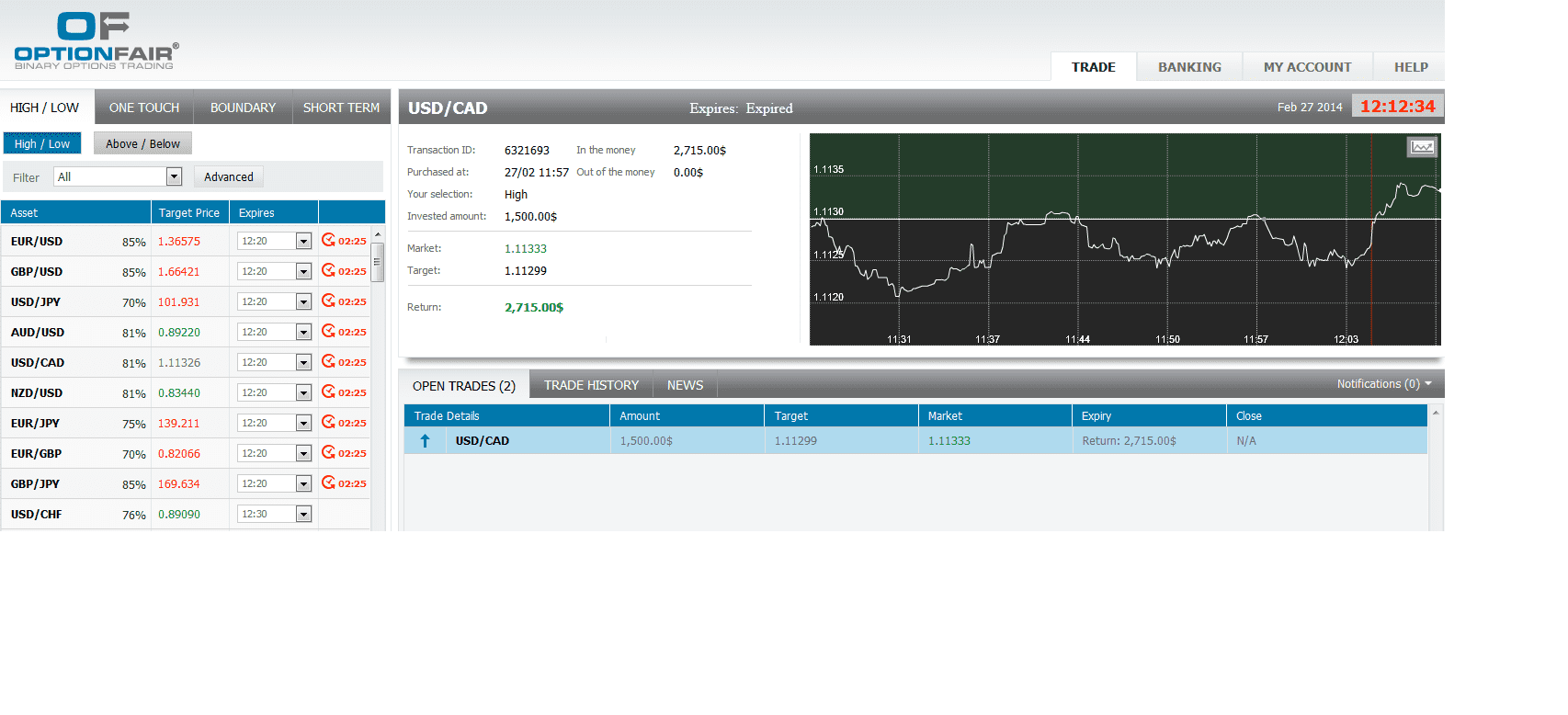 I logged in the OptionFair™ binary options trading platform and I traded $1500 on the "High" instrument. This kind of option has a return of 81% if the option closes above the target price, which means that if the signal is correct I could get a return of $1215 on my investment.
