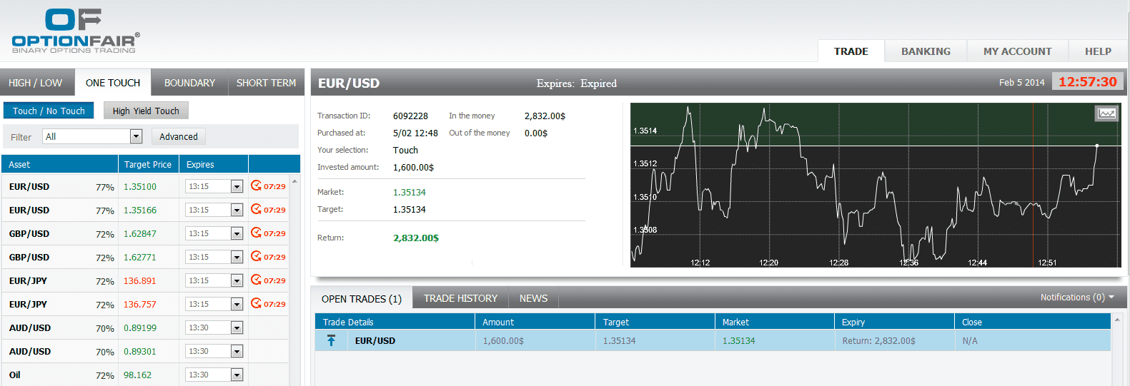 I logged in the OptionFair™ binary options trading platform and I traded $1600 on the “Touch Up” instrument. This kind of option has a return of 77% if the option touches the strike price prior to expiry, which means that if the signal is correct, I could get a return of $1232 on my investment.
