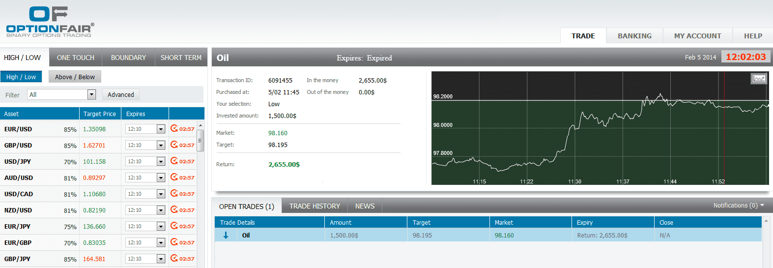 The market price for the OIL at the buying time (11:45) was 98.195 for the expiration of 12:00. The Asset closed on 98.160 and I made $1155.